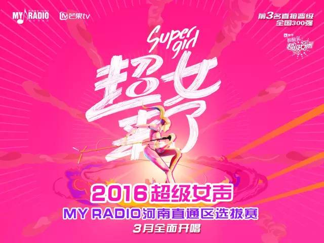 My Radio聯合芒果TV,2016超級女聲My Radio河南直通區選拔賽重磅開啟!河南賽區冠亞季軍,直接晉級全國300強。
