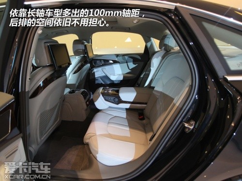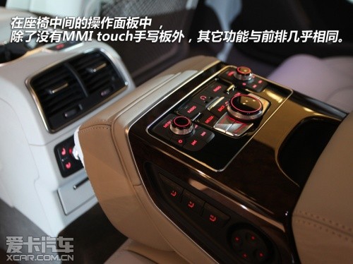 轉至后排,這里應該同樣是車主們最為關注的,依靠長軸車型多出的100mm軸距,后排的空間依舊不用擔心。而影音娛樂系統也同樣沒有被忽視,在座椅中間的操作面板中 ,除了沒有MMI touch手寫板外,其它功能與前排幾乎相同。