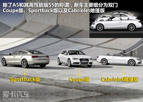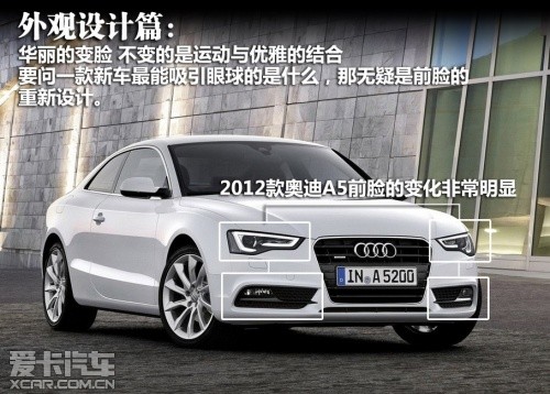 2012款?yuàn)W迪A5屬于中期改款車型,在外觀、內(nèi)飾、動(dòng)力和底盤上都有較為明顯的變化。除了A5和其高性能版S5的稱謂,新車主要細(xì)分為雙門Coupe版、Sportback版以及Cabriolet敞篷版。