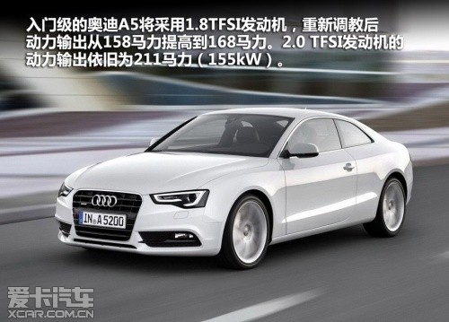 入門級(jí)的奧迪A5將采用1.8TFSI發(fā)動(dòng)機(jī),重新調(diào)教后,動(dòng)力輸出從158馬力提高到168馬力。2.0 TFSI發(fā)動(dòng)機(jī)的動(dòng)力輸出依舊為211馬力(155kW)。
