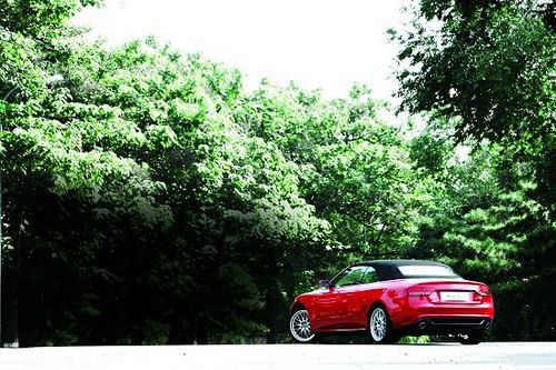 雖然對奧迪A5 Cabriolet 2.0T已經非常熟悉,但在走到它身邊的時候還是興奮不已。毋庸置疑,火紅色的奧迪A5 Cabriolet 2.0T實在是太美了,低矮的車身極具運動韻味,黑色的折疊軟頂在紅色車身的映襯下非常搶眼。最令人欣喜的是,奧迪A5 Cabriolet 2.0T的前風擋外框采用了亮銀色涂裝,并延伸至駕駛艙周身,構成了一個完整的裝飾圈,起到了畫龍點睛的作用。