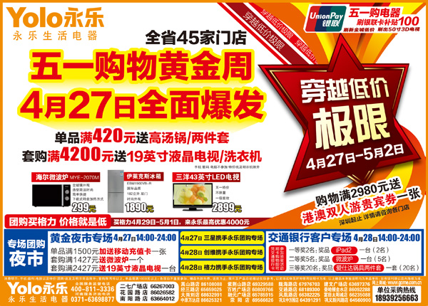 據悉,今年五一,永樂電器向中外800多家電器廠家拋出30億規模的采購大單。借助于30億大單的規模優勢,永樂將于4月27日發起五一黃金周降價潮,其中,彩電產品全場7折起,50英寸3D彩電價格更是首次降價幅度超過25%,合資品牌46英寸LED網絡電視跌破7000元,合資品牌三洋32英寸液晶電視僅售1699元;空調方面,格力、美的、海爾、志高、伊萊克斯、TCL、三洋等知名空調廠商的2012主打產品五一期間全部上陣永樂各大賣場,舉行大型特賣活動,使空調價格下降25%左右。1匹空調永樂五一最低降至2000元以下,而且不限量供應,更驚爆的還有一款1.5P的空調僅售價1999元,且大量供應100臺;洗衣機價格平均降幅達30%,冰箱產品平均降幅也在30%以上,對開門冰箱首度跌破3500元。此外,廚衛產品也將出現全年最大幅度的讓利優惠,煙灶、熱水器等產品將以直降為主,購買套餐組合優惠力度更大,方太經典歐式煙灶套餐僅3700元左右,華帝廚衛全場5折起,伊萊克斯電熱水器驚爆價999元;暢銷小家電也將大幅優惠讓利。3C產品優惠力度更大。其中HTC、索尼愛立信、諾基亞等品牌新品、暢銷品超低價銷售,千元智能手機大量供應;數碼產品方面,佳能、索尼、尼康、奧林巴斯、三星等品牌全面低價讓利,降價幅度高達20%。1200萬數碼相機跌破700元。最熱門的佳能600D單反數碼僅售5287元另加送多重禮品;同時,電腦產品也有不同程度的優惠,戴爾2G內存、500G硬盤、雙核處理器、獨立顯卡的筆記本電腦永樂專享價僅2999元。