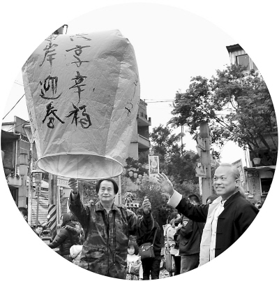 近日,臺灣毫芒雕刻家陳逢顯(右)與傳統天燈工藝大師林國和(左)一起放飛寫有“兩岸迎春· 共享幸福”的天燈。新北市平溪區放天燈久負盛名,已有百余年歷史。 王東明攝