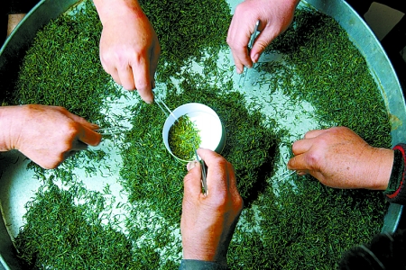 圖 浉河區白龍潭村茶農把加工好的春茶分揀去雜。
