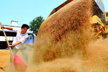 6月12日,息縣彭店鄉張莊村種糧大戶柳學友正在翻曬麥子。他今年種了2600畝小麥,通過精心管理,平均畝產達450公斤以上。記者 王天定 攝