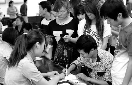 5月8日,在2012年民營(yíng)企業(yè)招聘周活動(dòng)武陟縣分會(huì)場(chǎng),一位求職者在填寫求職登記表。本次招聘周活動(dòng)該縣共有31家民營(yíng)企業(yè)參加,涉及工種116個(gè),提供就業(yè)崗位1439個(gè)。馮小敏 張新草 攝