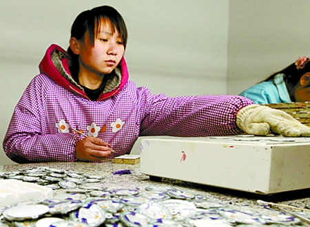 信陽市平橋區明港鎮大營村利用城郊地理優勢,通過招商引資吸引外來投資3億多元。圖為3月27日,村民正在村里的合盛五金飾品加工廠制作徽章。 河南日報記者 鄧 放 攝