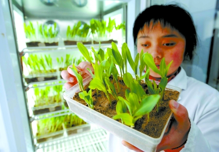 3月27日,浚縣種子站工作人員在查看光照培養(yǎng)箱里培養(yǎng)的種苗。近年來,浚縣實(shí)施“科技興糧”戰(zhàn)略,糧食生產(chǎn)連年獲得豐收。目前,浚縣100多萬畝小麥長勢(shì)良好。 新華社發(fā)