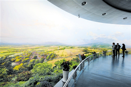 3、四層《錦繡中原》全景圖,給你全方位展示全省十八個省轄市的山川原野、城鄉風光、名勝古跡、人文景觀,在這幅宏偉畫卷里,讓你領略什么是歌天頌地、富于創新、震撼人心,中原大地有著怎樣的遠古、現代和未來。
