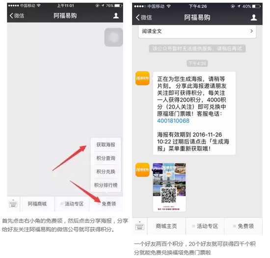 11月21日——11月25日和11月28日——12月2日十天時間里,每天免費送票100張,怎么領取?先搜索并關注“阿福易購”微信公號,剩下的您可看好了。