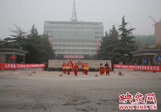 為了表達對滎陽警方的感激之情,20日上午8時許,盧女士就和家屬一起來到滎陽市公安局大門口,敲鑼打鼓地舉著兩面錦旗表示感謝。映象網記者看到,在公安局大門兩側,有兩個紅色條幅格外顯眼,“千里奔波,心系群眾,滎陽警方跨省解救被困男孩”,“心存感激,無法表達,孩子父母跪謝滎陽人民警察”。