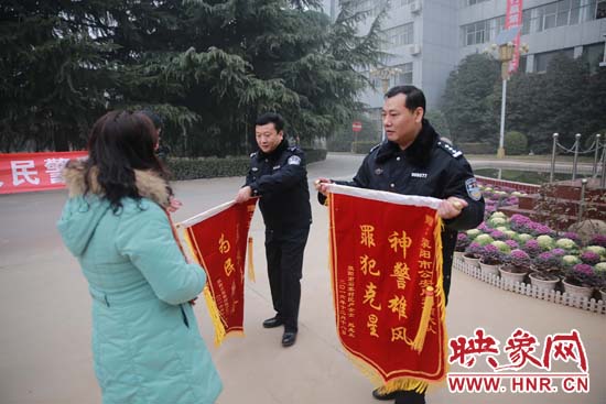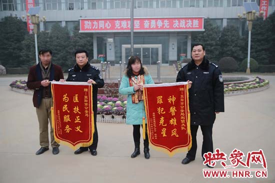 映象網訊(記者 王文凱 通訊員 牛智瑞 薛勇)滎陽17歲男孩盧健(化名)在被困傳銷窩點21天后,滎陽警方跨省將其營救。20日上午8時許,心存感激的孩子父母及親屬敲鑼打鼓來到滎陽市公安局,把“匡扶正義,為民服務”“神警雄風,罪犯克星”,兩面錦旗贈給公安局,局長夏日紅和政治部主任楚宏偉親自從家屬手中接過兩面錦旗。無法表達內心感激之情的盧女士拿出兩萬元現金要對專案組民警表示謝意,遭到夏日紅局長拒絕。