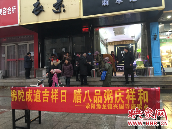 5日早上7點雖然下著小雨,滎陽市康泰路于廣武路交叉口西約100米路北,一家“翡翠紀”的店門口前卻是熱鬧非凡,一名身著僧服的僧人正在給過往市民從保溫桶里盛出熱氣騰騰的臘八粥。商家老板,上學學生,環衛工人等紛紛來到門前,端著臘八粥喝了起來。