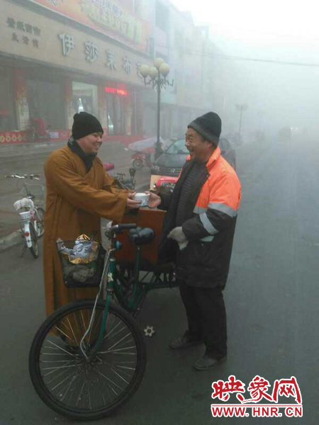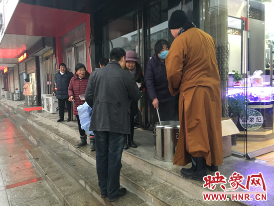 僧人名叫釋妙亮,是滎陽市豫龍鎮興國寺法師。他說,早上6天他們出發了,截止早上7時30分,他們已經免費送了三桶臘八粥。
