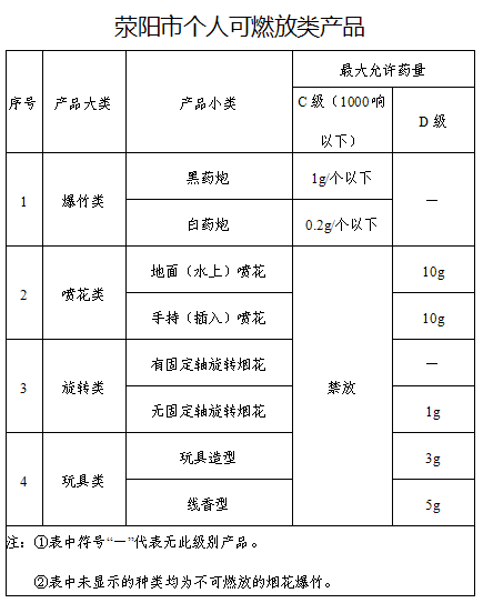 全市禁放區域以外的其他區域,除《煙花爆竹安全與質量》(GB10631—2013)規定的1000響以下的C級爆竹和D級煙花外的其他等級、種類的煙花爆竹一律禁止燃放。