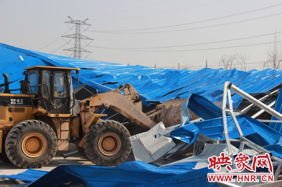 “轟”的一聲,位于滎陽市京城辦康砦村龍港路段南側附近一個私自搭建的彩鋼瓦棚被鏟車鏟倒,標志著京城路街道拆除違法占地、違法建筑活動的正式開始。