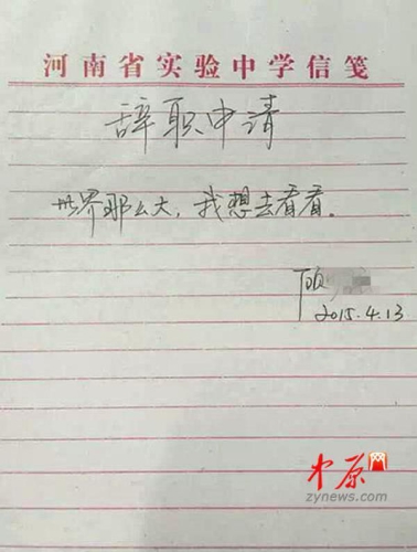 “世界那么大,我想去看看。”今年4月,鄭州的中學女老師顧少強因為一封被贊為“史上最具情懷辭職信”在網絡上掀起風浪。