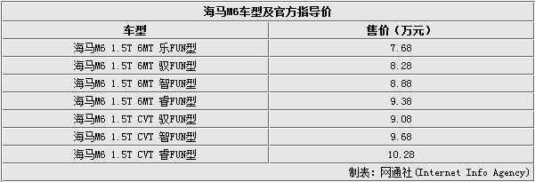 2.   海馬汽車在進入新一輪快速發展期以來,除了實現產品平臺的升級和新產品的推出之外,最重要的一項便是創新技術運用。海馬旗下全新A+級轎跑車M6正是遵循此理念推出的車型。網通社在上海車展第一時間發回現場報道,海馬M6于今日正式上市,新車售價區間為7.68-10.28萬元,共7款車型。這款新車搭載了一臺1.5L渦輪增壓發動機,匹配CVT變速箱。此外,新車還是海馬旗下首款搭載“moofun”系統的車型。