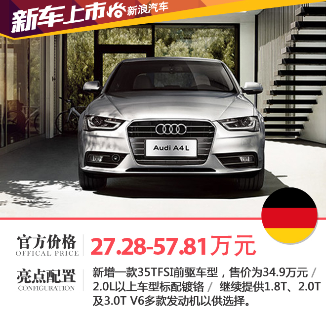 新浪汽車訊 日前,一汽-大眾奧迪官方宣布,旗下2016款A4L正式上市,新車售價區間為27.28-57.81萬元。2016款A4L在原A4L產品序列基礎上新增一款35TFSI前驅運動型車型,售價為34.9萬元。