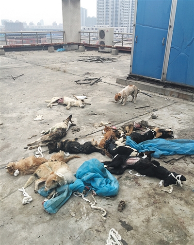 5日,西安醫學院一實驗樓樓頂上,數十只狗身上滿是傷痕,有的疼得抽搐。愛心志愿者供圖