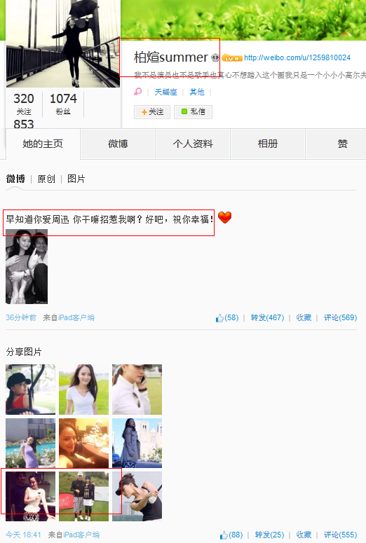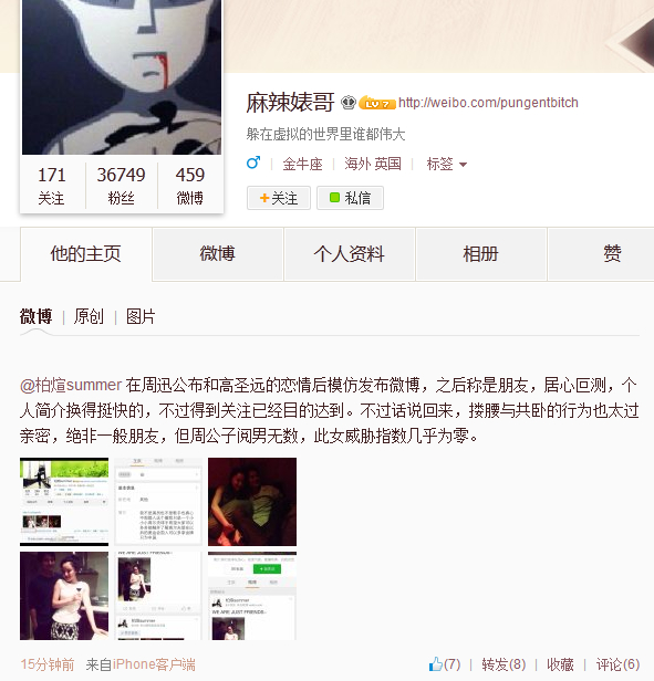 該微博也引起了不少熱心網(wǎng)友的注意,微博@麻辣婊哥懷疑@柏煊summer在刻意炒作,微博稱:“@柏煊summer 在周迅公布和高圣遠(yuǎn)的戀情后模仿發(fā)布微博,之后稱是朋友,居心叵測(cè),個(gè)人簡介換得挺快的,不過得到關(guān)注已經(jīng)目的達(dá)到。不過話說回來,摟腰與共臥的行為也太過親密,絕非一般朋友,但周公子閱男無數(shù),此女威脅指數(shù)幾乎為零。 ”