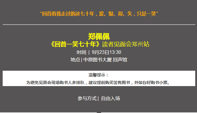 本次活動我們選5位幸運網友,將會有機會獲得前排位置,與鄭佩佩近距離接觸,并贈送中原圖書大廈提供的小禮物。大家可以通過以下方式進行報名。