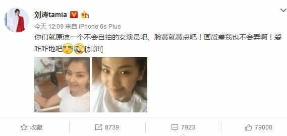 近期,劉濤在微博上面曬出了兩張照片,附文“你們就原諒一個不會自拍的女演員吧、臉黃就黃點吧!畫質差我也不會弄啊!愛咋咋地吧”!