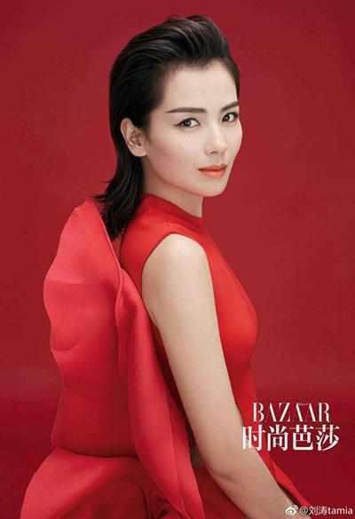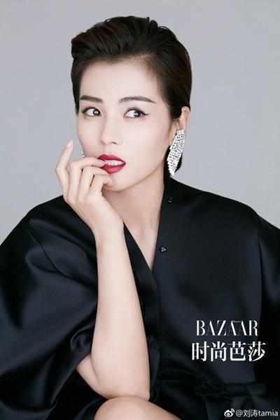 為雜志拍攝大片的時候,劉濤身穿黑色的寬松衣服,后背短發,烈焰紅唇,個性十足的耳飾,整體造型又酷又美的!
