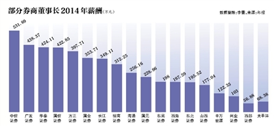 就券商董事長薪酬來看,2014年薪酬超過400萬的包括中信證券董事長王東明,薪酬為531萬元;廣發證券董事長孫樹明438萬元;華泰證券董事長吳萬善424萬元;國信證券董事長何如423萬元。