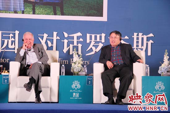 12月20日,河南省委宣傳部副部長、省新聞出版廣電局局長朱夏炎(右)與羅杰斯就文化產業投資展開對話。