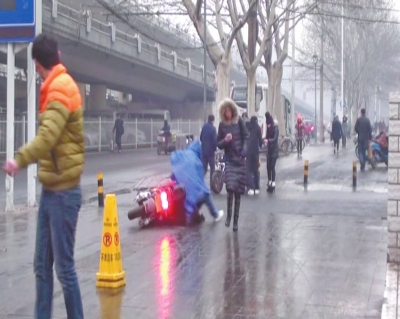 附近一名環衛工稱,昨日凌晨,有泔水車經過,將泔水油灑了一地,夜里凍成一條冰帶,早上很多人在這里摔倒,他就親眼看見,一個多小時有四五十輛電動車翻倒。