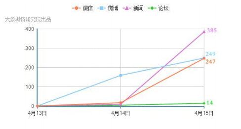 上圖可以看出,自4 月14 日辭職信流傳開來,網絡關注度持續 攀升。其中,微博關注度始終處于較高態勢,成為此事件的傳播主場。
