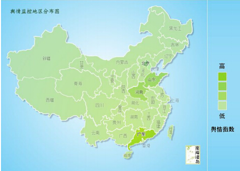 下圖為輿情監控地區分布圖,大象輿情研究院通過對此事件相關報道網站ICP監管所屬地區的挖掘分析,廣東媒體的傳播活躍度最高,這與廣東地區歷來開風氣之先、敢作敢為的特征相吻合;其次是 北京、山東、河南的媒體。