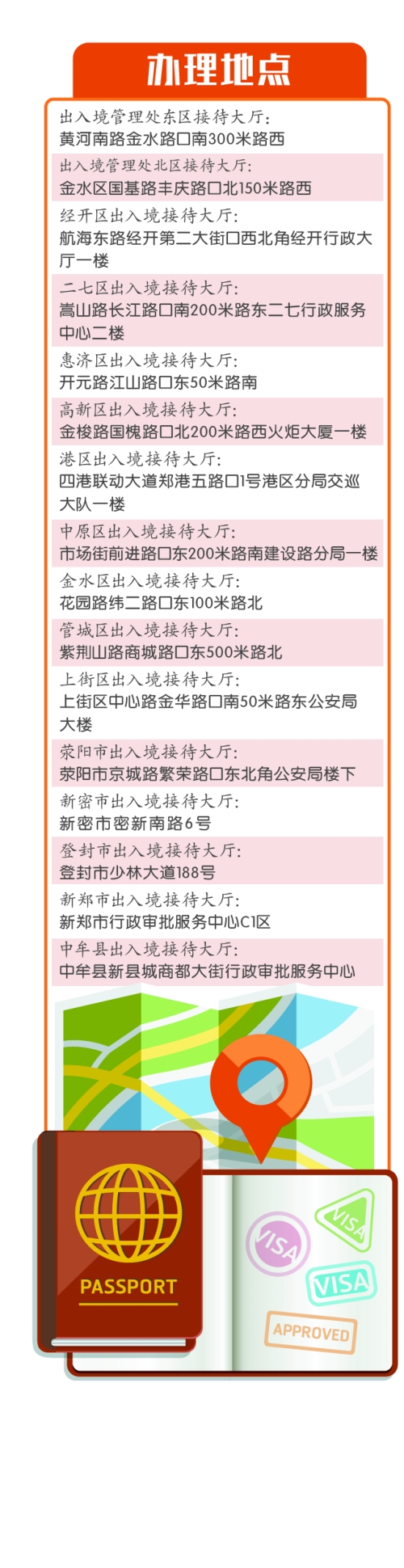 要辦理出入境證件,不一定扎堆到位于鄭東新區的出入境管理處接待大廳。河南商報記者了解到,居住證持有人可在鄭州市各個出入境接待大廳辦理,包括出入境管理處東區接待大廳及北區接待大廳、各個區(縣)出入境接待大廳共計16個辦事大廳。