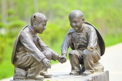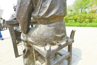 其中,第一組雕塑體現的是一個小男孩和一個小女孩在一塊石板上玩耍的場景,但十分刺目的是,小男孩右胳膊從腕關節上方處被鋸掉,右手不知去向,同時小女孩的兩個羊角辮也被鋸了一半;第二組是一個老年人和一個年輕人在切磋技藝的場景,但所用桌子的兩個桌牚均被鋸掉;第三組中,圍繞方桌飲酒賦詩的幾位老者所坐椅子靠背均被掰掉。