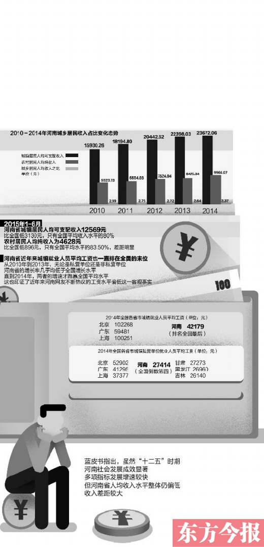 藍皮書指出,雖然“十二五”時期河南社會發展成效顯著,多項指標發展增速較快,但河南省人均收入水平整體仍偏低,收入差距較大。□東方今報首席記者 李凌全省經濟發展并不平衡。豫北豫西發展較快,豫東豫南發展較慢,但是在收入分配領域中,全省18個省轄市之間收入水平雖然存在著不小的差距,但并不與經濟發展同步。