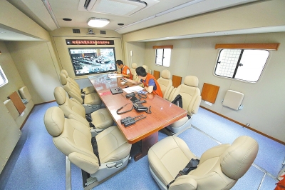 記者看到,車輛指揮間可容納15人開會。車輛也可以接收地震災害現場信息,服務于地震災情的快速、動態評估和救援輔助決策。車內安裝有上下臥鋪,可供工作人員休息,還有冰箱、飲水機、微波爐等設備,可以滿足地震工作人員的野外需求。