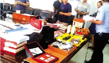 2.   在警方展示贓物的現場,各種玉石、陶瓷、珠寶、金表、類似兵馬俑的古董、冬蟲夏草、古書、紀念幣、郵票、筆記本電腦、平板電腦等滿滿一桌子物品著實讓人看得眼花繚亂。