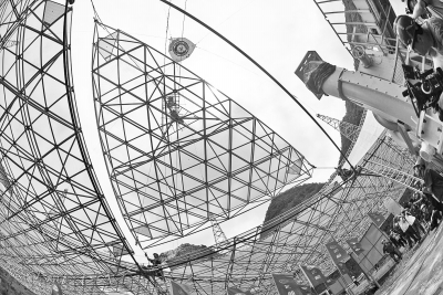 7月3日,FAST工程的最后一塊反射面板正在吊裝。新華社發