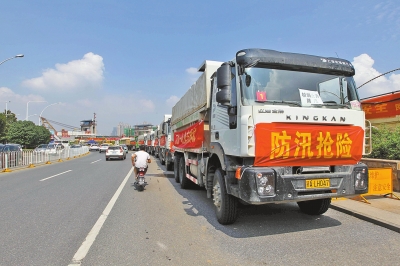 昨天,武漢市江漢區(qū)沿江大道,一排排渣土車(chē)滿(mǎn)載渣土,停靠在路邊。長(zhǎng)江北岸的堤壩上,到處張貼著“人在堤在”、“誓死保衛(wèi)大武漢”等宣傳標(biāo)語(yǔ)。