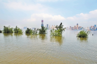 武漢,江灘上的大樹(shù)只露出樹(shù)梢。