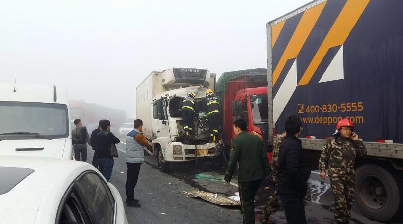 據現場郭先生描述:大概有4輛貨車,1輛中巴車,4輛私家車連環追尾,他就在這幾輛事故車后方,當時受大霧影響,能見度50米左右,前方堵車,結果這幾輛車都沒剎住,直接相繼撞上了,郭先生說“幸虧當時我車速不算快,及時把車剎住,不然前方就是一輛貨車,撞上去的話后果不堪設想,現在我的手都是抖的,太恐怖了”。