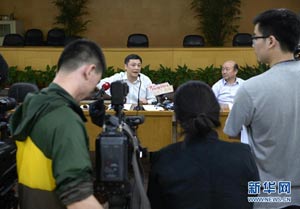 5月18日,杭州市環保局長胡偉(左)在發布會上回答記者提問。