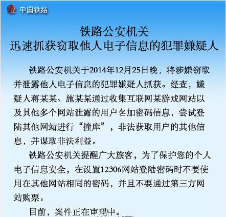 10、涉嫌竊取12306網站用戶信息者被抓獲