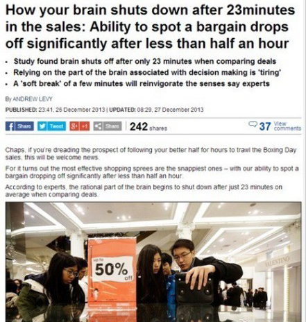 研究指出,一般人在購物23分鐘后,大腦理性估價的能力就會下降,逐漸失去理智。只要一見特價,就會立即進入失心瘋狀態亂買東西!解決方法是可以每隔半小時停下來喝杯咖啡。。。