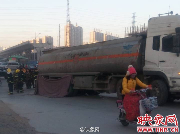 今天(1月19日)早上7點20分左右,鄭州市中州大道航海路上,一輛油罐車將一騎電瓶車男子碾倒在車下,事故現場被布遮擋,估計很慘。目前罐車司機已被控制住,事故還在處理中。
