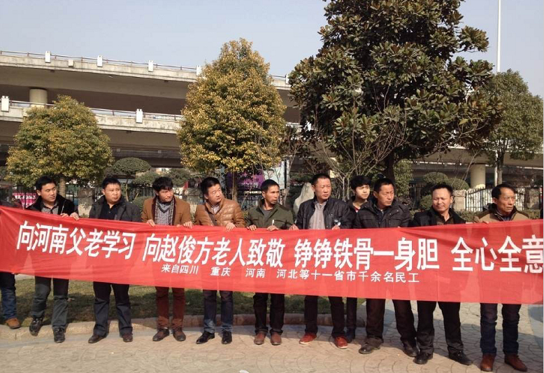 去年11月,濮陽老人趙俊方(2010年“感動中國”候選人)遠赴山東聊城陽谷,幫13省1000余農民工討薪,經過近兩個月努力,要回280萬。為表感謝,1月17日,來自6個省份的農民工兄弟齊聚鄭州,為老人送來錦旗。