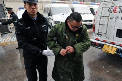 尹相杰頂著雪穿著綠色軍大衣被法警帶進法院,等候審理。朝陽法院供圖