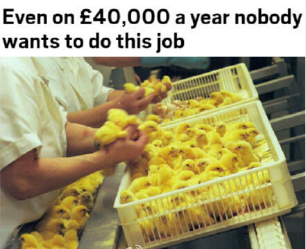 小雞性別鑒定師! 大概一天要看800-1200只小雞的屁屁鑒定他們的性別。。。 年薪4萬英鎊。。。 英國現在都沒人愿意去做這個。。也許一天還好。。。你能忍受成年累月的看雞屁屁么-。-?