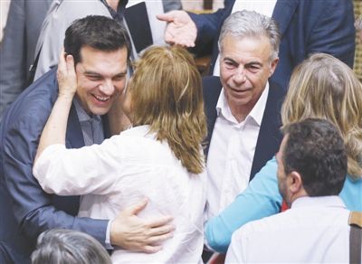 11日,希臘議會通過旨在解決債務問題的新協議草案,議員擁抱總理齊普拉斯表示祝賀。